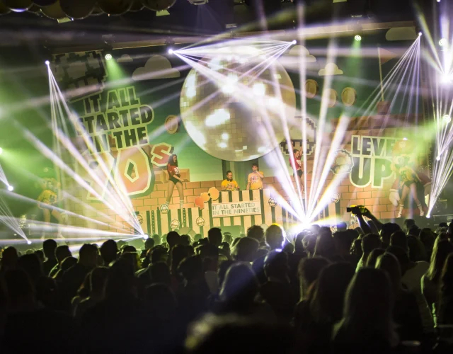 Deze totaalbeleving met danseressen, live artiesten, VJ, decor, verschillende 90’s figuranten en een niet te stoppen DJ/MC duo laat je ogen wijd openstaan en doet je verlangen naar die gouden tijd met Flippo’s, Super Mario en de Gabbers!
