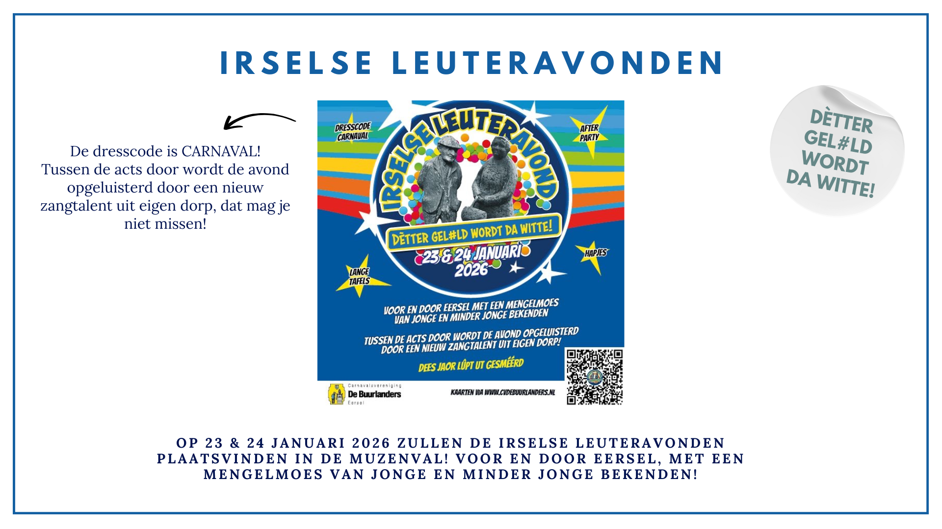Om in de stemming te komen voor carnaval 2026 zijn er op 23 en 24 januari weer de Irselse Leuter Avonden. En “dètter geluld wordt da witte!”. Avond vol vermaak en
